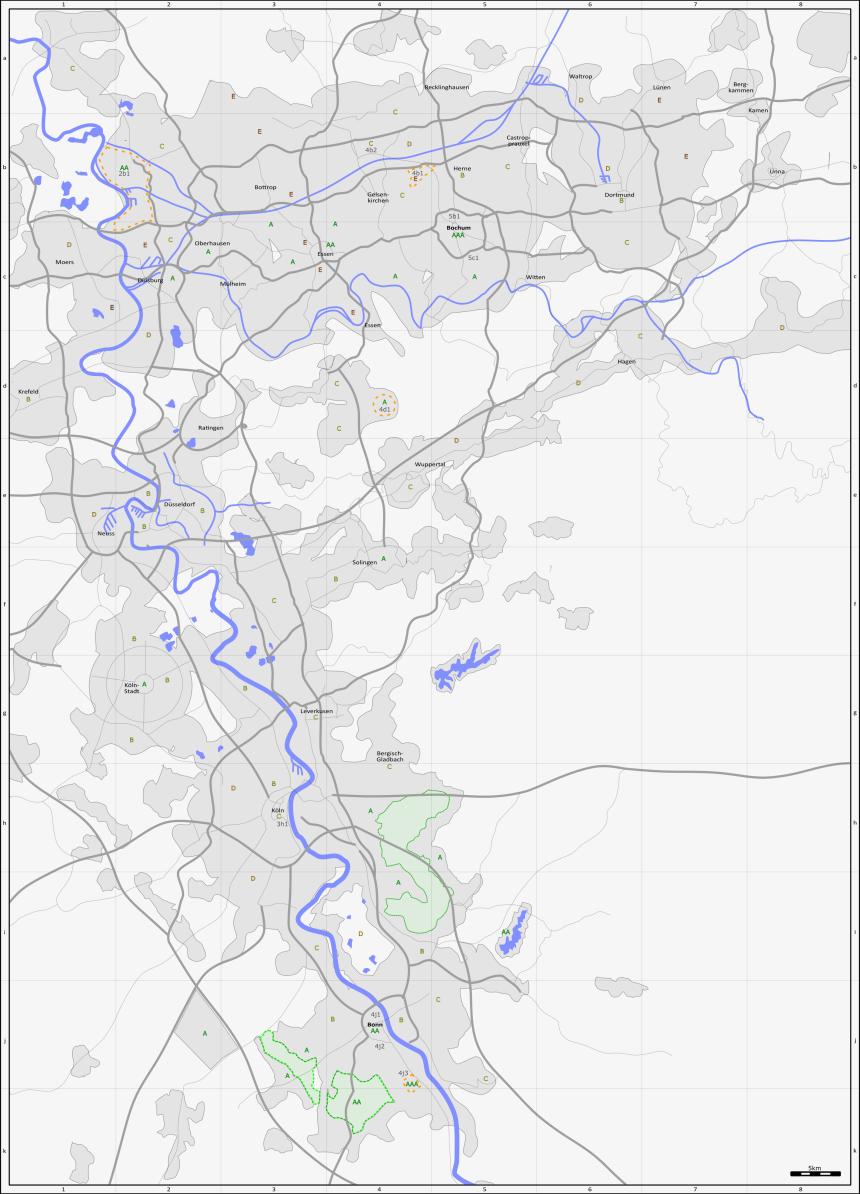 - Sowohl der Ruhr-Megaplex (Rathaus in Bochum) als auch Bonn-Düsseldorf-Megasprawl (Rathaus in Düsseldorf) versuchen mehrmals den jeweils anderen zu schlucken.