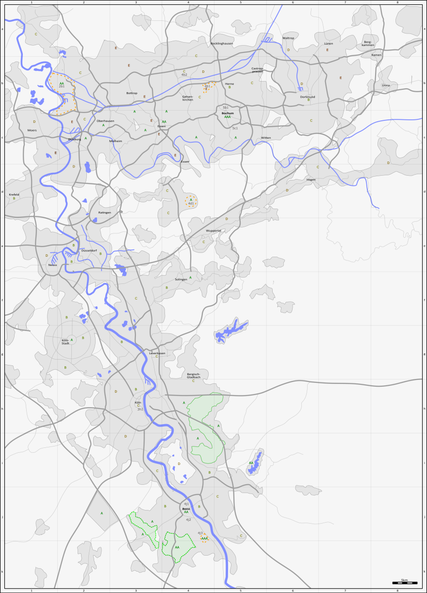 Bonn-Düsseldorf-Megasprawl und Ruhr-Bochum-Megaplex mit urbaner Ausdehnung (hellgrau), Autobahnen (dunkgelgrau), Parks mit künstlich aufgepeppelter Vegetation (grün), Sicherheitszonenen (organgen gestrichelt) und allgemeiner Sicherheit, AAA-A: (nahezu) flächendeckende Kamerwachung, Sicherheitskiosks, Bereitschafts-polizei/Sicherheitsdienst und Drohnen (AAA: 1W6 bis A: 3W6 Runden Reaktionszeit); B: Kamerwachung an wichtigen Orten, Bereitschaftskpolizei/Sicherheitsdienst (das B-Team); C: Oft kaputte Kameras, Ab und an Streifen (lieber mal Kopf unten halten), div. Bürgerwheren; D: Etablierte Banden und Bürgerweheren; E: Städnig wechselnde Reviere und sei dein eigener Held :)